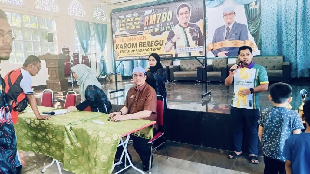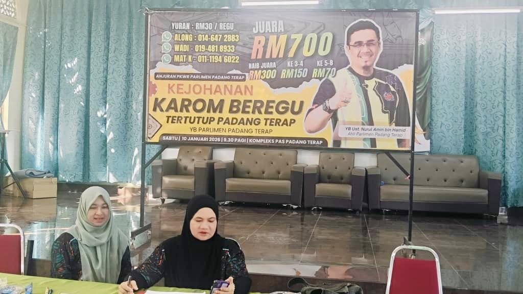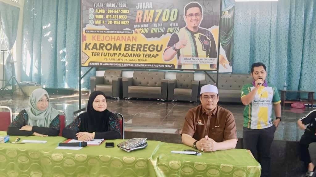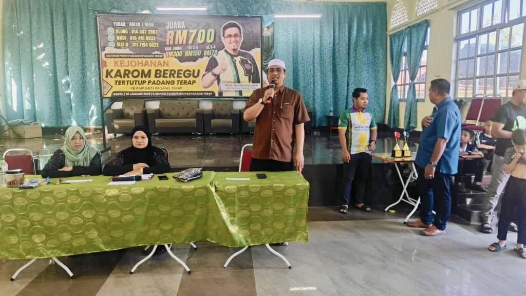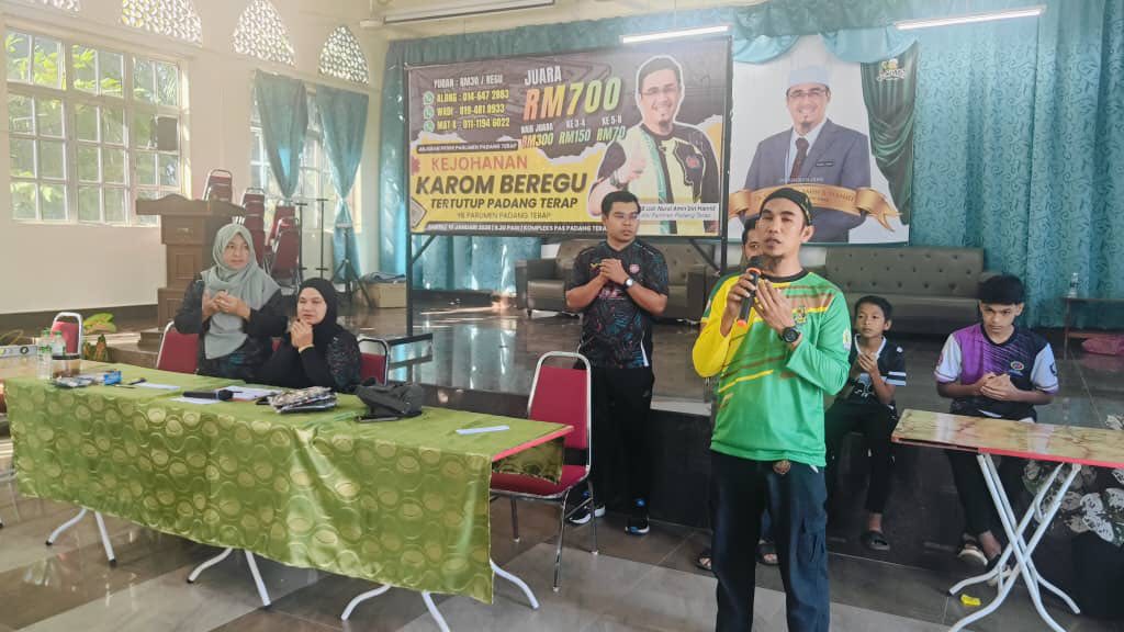 10 Januari 2026-“Penganjuran kali ini yang teramai sekali penyertaan di Padang Terap” ujar Along (Wan Muhd Hafiz) Ketua Kelab Karom Padang Terap yang menguruskan Pertandingan Karom Beregu Tertutup Piala YB Ahli Parlimen Padang Terap yang berlangsung hari ini di Kompleks PAS Padang Terap Kg Barokhas Kuala Nerang.